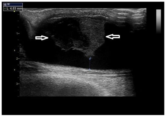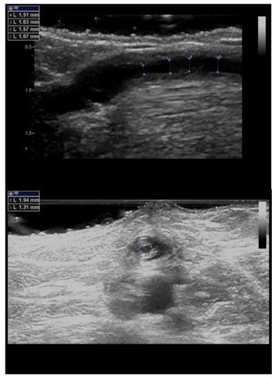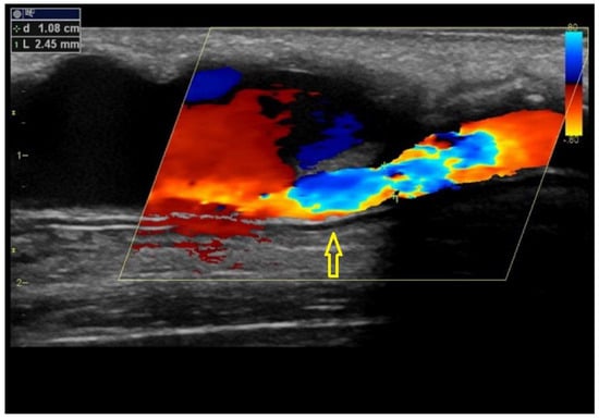 Surveillance is the term used for the regular assessment of AVF/AVG by DUS. Given the advances of DUS, which include precise non-invasive visualization, including the quantification of the flow volume, the idea of performing DUS surveillance seems to be very attractive. Its philosophy is based on the regular ultrasound AVF/AVG assessment with preemptive intervention (usually by percutaneous balloon angioplasty) when a significant stenosis is present. Considering surveillance techniques, the higher is the risk of a stenosis in the access, the higher the benefit of surveillance. AVFs have the longest long-term patency, but up to 50% of AVFs never mature [35]. AVF maturation could be facilitated by PTA [36], and DUS can be effectively used for depicting the outflow vein and its stenosis (Figure 9). AVGs have shorter patency than AVFs, especially due to significantly more frequent stenosis development by intimomedial hyperplasia, especially in the venous anastomosis or adjacent outflow vein [37]. Shortly, surveillance could be more beneficial in AVGs, and indeed, most of the surveillance trials studied AVGs. Various randomized controlled trials analyzed the benefit of AVG surveillance [38,39,40,41,42]. Their findings were conflicting. However, the trials differed in the number of patients (the largest study included 192 subjects) by including incident or prevalent patients in the treatment methods (PTA vs. surgery), but particularly in the criteria of stenosis significance. While some authors used only the combination of lumen narrowing in B-mode + flow acceleration, others used more detailed complex criteria shown in Table 1 but with different cut-off values of the residual diameter. Unfortunately, two meta-analyses [43,44] put together all of these conflicting and heterogenous data and concluded that ultrasound surveillance does not bring benefit to the patients. As a result, instead of performing a larger multicentric trial and testing its benefits, currently, surveillance is not generally supported for AVGs and is considered doubtful for AVFs [45,46].