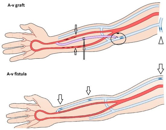 Typical sites of arteriovenous fistula or graft stenoses (arrows).Legend: Medial calcinosis of the forearm arteries may affect both AVF/AVGs. Native AVFs stenoses develop most frequently in the outflow vein just proximal to the anastomosis in the puncture area or more centrally—in the cephalic arch. In AVGs, stenoses may affect the venous anastomosis, the adjacent outflow vein segment, or the outflow vein more proximally. Again, repeated punctures into the same site could lead to graft stenosis induced by healing and scar formation.