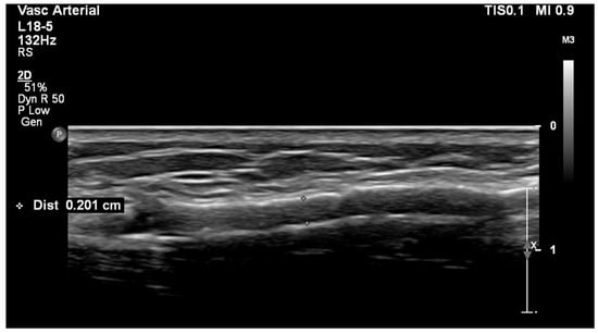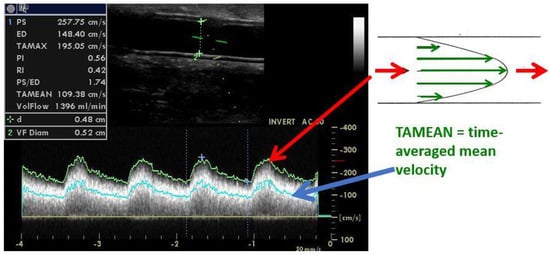 The flow volume through the vascular access (Qa) is considered to be a functional marker. It can be measured during hemodialysis by dilution techniques and at any time by DUS. The principle of the Qa calculation by ultrasonography is shown in Figure 8. In native AVFs, Qa is usually measured in the brachial artery. This is because the outflow vein frequently has an irregular diameter, side branches, and is easily compressible by the ultrasound probe, which changes its circular cross-section to a parabolic one. When the cross-section changes to parabolic, the equation mentioned below is not valid anymore. In patients with arteriovenous grafts, Qa is measured directly in the graft and in a straight segment close to the venous anastomosis. However, some centers measure Qa directly in the outflow vein [30]. Measuring Qa at least three times and using the average value are advised. The sample volume should encompass the entire vessel’s diameter to include the low-velocity layers present along the vessel wall. Measurement in a straight vascular segment is mandatory to assure the quantification of a laminar flow. Usual Qa values reach 500–1500 mL/min in AVFs and 600–1500 mL/min in grafts. Low values bring the risk of inadequate hemodialysis and access thrombosis. Higher values could be associated with heart failure or hand ischemia [31]. Importantly, Qa physiologically fluctuates with blood pressure and hydration levels—as does the cardiac output [32].
