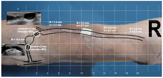 - Quencer, K.B.; Arici, M. Arteriovenous Fistulas and Their Characteristic Sites of Stenosis. Am. J. Roentgenol. 2015, 205, 726–734. [Google Scholar] [CrossRef]