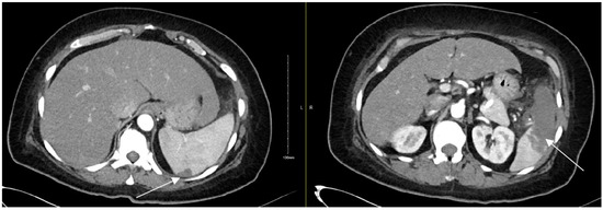 Abdominal and pelvis CT showing a large hypodense area in the lower pole of the spleen with and another upper pole linear hypodensity, representing infected splenic infarction. The white arrows point at hypodense areas indicating splenic infarction.