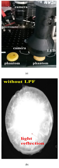 To ensure effective specular reflection removal, the experimental device shown in Figure 15 must be used. A schematic diagram of the experimental setup consists of a camera, an LPF, and an LED, and the results are obtained using the ICG phantom.