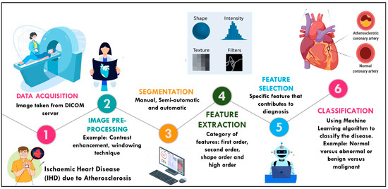According to a report from the World Health Organization, in 2019, ischemic heart disease (IHD) was the number one silent killer worldwide, including in Malaysia, with 17.9 million people dying every year due to cardiovascular disease (CVD) [1]. IHD occurs when there is a reduction in the oxygen content carried by the blood vessels to the heart. This can be caused by a blockage by plaque inside the wall area of the blood vessels, known as atherosclerosis. There are three types of atherosclerosis—calcified, semi calcified, and noncalcified plaque [2]. Generally, patients with suspected acute coronary syndrome (ACS) or even without symptoms can undergo the health-screening procedure of coronary computed tomography angiography (CCTA), the invasive coronary angiography (ICA) procedure, and intravascular ultrasound (IVUS) [3]. The radiologist will analyze the image and based on the percentage of blood vessel blockage, classify it as grades 0, 1, 2, 3, or 4 or use the standard reporting system in CCTA, which is CADRADS [4]. CADRADS was developed to standardize the reporting of CCTA, improve communication, and guide therapy. It was published in 2016 by the Society of Cardiovascular Computed Tomography (SCCT), the American College of Radiology (ACR), and the North American Society for Cardiovascular Imaging (NASCI) and has been endorsed by the American College of Cardiology (AC). CCTA has been acknowledged as a noninvasive technique to diagnose and detect atherosclerotic plaques [5,6]. CCTA can highlight the main vessels and identify the plaque morphology, enabling the planning of treatment and estimating the risk stratification in patients with CVD [5,6,7,8,9]. In clinical practice, the radiologist will visualize and interpret the CCTA by assessing the qualitative features of the images. However, this subjective evaluation requires full attention to detail, which may be overlooked if there is too much diagnostic study [10]. As the diagnosis is a subjective assessment highly dependent on the expertise level of the readers, interobserver reproducibility has been found to be low [4]. Hence, precision medicine was established, enabling more precise tools to detect and characterize diseases [11].