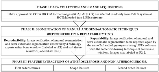 This research used a single-blinded type of study whereby only the researcher knows the report of the patient. The report was used in the first place to distribute the patient selection based on patient diagnosis. The sample was taken randomly including normal patients, calcified plaque, and noncalcified plaque. Then, two radiology experts were blinded by not knowing the patient’s diagnosis and they were both not among those who carried out the reporting on the sample of images. Patient identifications were voided to reduce bias during the image segmentation process. The CCTA images were renamed into sequence of number to avoid patient identification being revealed during the segmentation process. Both manual and semiautomatic segmentation processes were carried out using Local Image Feature Extraction (LIFEx) software (version 7.0.16, Orsay, France) [36]. LIFEx is a free and open-source software platform for analyzing 3-dimensional (3D) medical images, intended for research purposes only, and has not been reviewed or approved by the Food and Drug Administration (FDA) for clinical purposes. Figure 2 shows the overall research workflow in comparing and analyzing the radiomics features that were extracted.