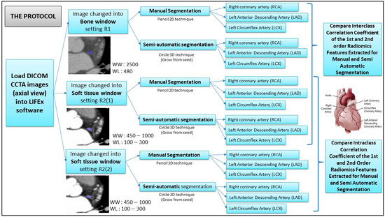 Based on the lesion (volume of interest: VOI) areas of the CCTA images on the axial plane, only 3 axial slices of images were chosen to be segmentized. This is to standardize the VOI techniques of segmentation area on each vessel. The LIFEx software extracted the features of atherosclerosis and non-atherosclerosis using a radiomics application into first-order features, shape order features and secondorder features. The interclass and intraclass correlation (ICC) was counted as poor (ICC < 0.5), moderate (0.5 < ICC < 0.75), good (0.75 < ICC < 0.9), and excellent (ICC > 0.9), as referred to in [35]. The details of the research workflow are presented in Figure 3 below.