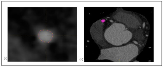 LIFEx software was used to perform manual and semiautomatic segmentation on RCA, LAD, and LCX. (a) Manual segmentation using pencil 2D technique with soft-tissue-windowing setting on RCA (b) The area of segmentation covered after manual segmentation with soft-tissue-windowing setting was performed on RCA.