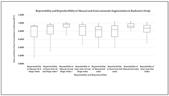 Figure 10 shows the overall result in a boxplot graph of comparing the reproducibility and repeatability between manual and semiautomatic segmentation for all radiomics features. It is clearly shown that the highest repeatability was in manual segmentation for the first-order and shape order features with an excellent median of ICC = 0.961 (p < 0.001), and ICC = 0.924 (p < 0.001) for the second-order features. The average mean of repeatability and reproducibility for the first-order and shape features’ (Cronbach’s alpha) measured ICC was 0.979 (p < 0.001) and 0.859 (p < 0.001) for the second-order features. Meanwhile, the highest reproducibility in semiautomatic segmentation for the first-order and shape order features had an excellent median of ICC 0.920 (p < 0.001).