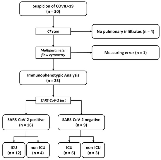 In total, 30 patients were hospitalized with suspected COVID-19 and enrolled in the study. CT scans revealed pulmonary infiltrates in 26 patients. The MPFC was performed without measurement errors in 25 patients, who were included in the final analysis of the immunophenotypes of myeloid cells (Figure 1).