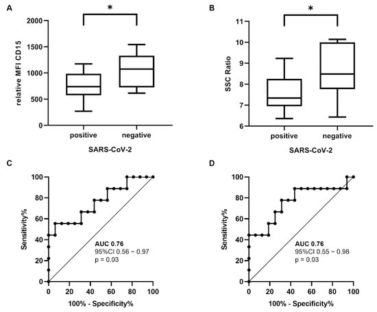 Immunophenotypic differences of the circulating neutrophil granulocytes. CD15 (A) and SSC ratio (B) were significantly reduced in patients with SARS-CoV-2 infection (difference ± SD; 295.70 ± 117.50 MFI; p = 0.02 and 1.11 ± 0.43 SSC ratio; p = 0.02). ROC curves showed an AUC of 0.76 for the CD15 (C) and SSC ratio (D). Mann–Whitney U test * p < 0.05 (abbreviations: n = number; MFI = mean fluorescence intensity; SSC = side-scatter; SARS-CoV-2 = severe acute respiratory syndrome coronavirus 2; AUC = area under curve; CI = confidence interval; ROC = receiver operating characteristic).