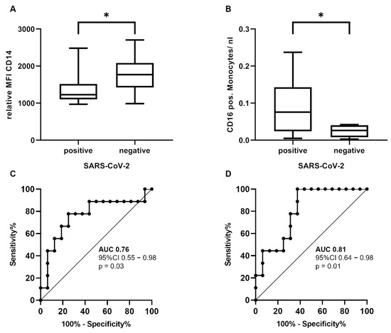 Immunophenotypic differences of the circulating monocytes. The CD14 expression (A) was significantly reduced (difference ± SD; 405.90 ± 177.40 MFI; p = 0.03) and the CD16 + monocyte count (B) significantly increased (difference ± SD; 0.07 ± 0.03 per nl; p = 0.01) in patients with SARS-CoV-2 infection. ROC curves showed an AUC of 0.76 for CD14 (C) and an AUC of 0.81 for the CD16 + monocyte count (D). Mann–Whitney U test with * p < 0.05 (abbreviations: n = number; MFI = mean fluorescence intensity; SSC = side-scatter; SARS-CoV-2 = severe acute respiratory syndrome coronavirus 2, AUC = area under curve; CI = confidence interval; ROC = receiver operating characteristic).