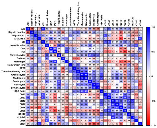 Correlation matrix of the neutrophil granulocytes and clinical parameters. Correlation matrix (heat map) of the immunophenotypic characteristics of the neutrophil granulocytes and clinical parameters of patients with COVID-19 in the ICU (n = 12). Spearman’s ρ ranks between ± 1.0 (dark blue, dark red), high (inverse) correlation, and ± 0 (white), no correlation (abbreviations: ICU = intensive care unit; n = number; APACHE = acute physiology and chronic health evaluation; CCI = Charlson comorbidity index; CRP = C-reactive protein; PCT = procalcitonin; APTT = activated partial thromboplastin time; SSC = side-scatter).