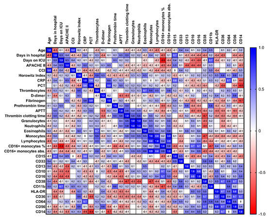 Next, we turn to the immunological differences between the patients with or without SARS-CoV-2 infection. We searched for markers of a severe course of COVID-19 infection within the patients who were admitted to an ICU (n = 12). The disease severity was assessed based on the APACHE-II score and Horowitz- index, which are related to the morbidity and mortality of ICU patients and the degree of ARDS, respectively. In addition, immunological characteristics were correlated with other clinical parameters, such as age, number of days in the hospital or ICU, the Charlson comorbidity index, inflammation (C-reactive protein and procalcitonin), coagulation (d-dimer, thrombocytes, fibrinogen, prothrombin time, activated partial thromboplastin time, and thrombin clotting time). The Spearmen’s correlation matrix results for the immunophenotypic characteristics of the neutrophil granulocytes are depicted in Figure 4, and those for the monocytes are depicted in Figure 5. Severe COVID-19 infection was correlated with a low CD16 expression (r = (−) 0.72; 95% CI (−)0.92–(−)0.23; p = 0.01) and high CD64 expression (r = 0.76; 95% CI 0.31–0.93; p = 0.01) in the neutrophil granulocytes, and ARDS was correlated with CD36 expression (r = 0.66, 95% CI 0.07–0.91; p = 0.03).