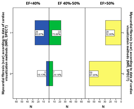 N—number of observations, EF—ejection fraction of the left ventricular, MRI—magnetic resonance imaging, SPECT—single photon emission computed tomography; 0—there is no fibrosis (scar); 1—there is fibrosis (scar).