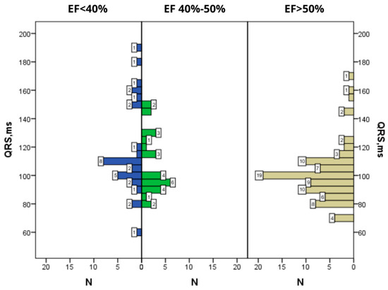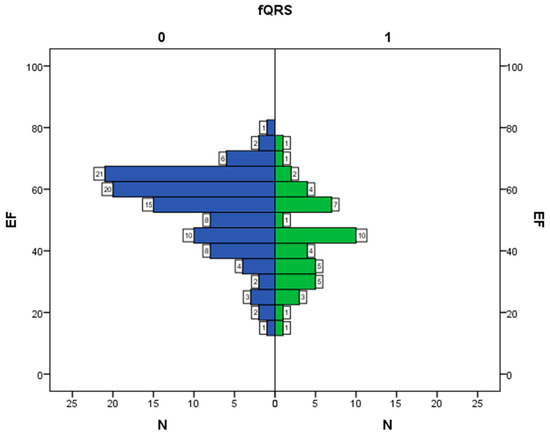 Figure 3 shows the histograms of EF distribution relative to values of the fQRS variable, which allows evaluating in detail the number of observations for each EF value. The result is statistically significant (p < 0.001).