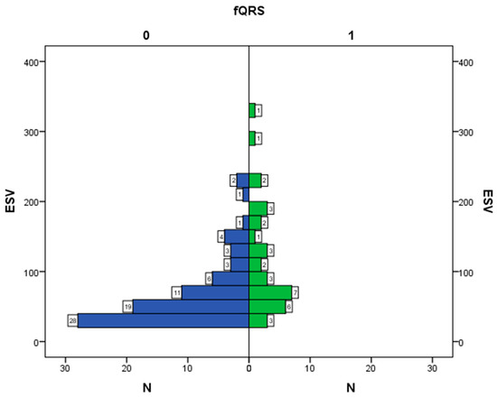Interrelation between fQRS and end-systolic volume; N—number of observations, fQRS—fragmented QRS complex, ESV—end-systolic volume, 0—there is no fragmented QRS complex, 1—there is fragmented QRS complex.