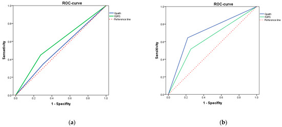 ROC curves for pathological Q wave and fQRS (a) in patients with mildly reduced EF; (b) in patients with lEF. Qpath—pathological Q wave, FQRS—fragmented QRS complex.