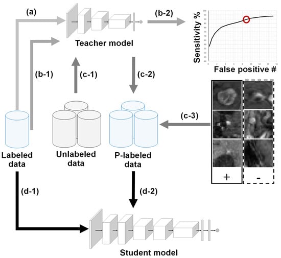 The goal of this study is to advance the BM detection framework [] via an NS-based self-training strategy to utilize a large corpus of unlabeled T1c data in a semi-supervised fashion. The BM detection sensitivity in connection with the number of false detections has been the main criteria for various BM detection solutions [,,]. Thus, the study introduces a sensitivity-based noisy-student training approach to factor in the BM detection sensitivity. To this end, the advanced framework uses (1) the CropNet-based architectures as the teacher and student models, (2) model and data noising procedures to enable knowledge expansion, and (3) a novel pseudo-labeling strategy to factor in the BM detection sensitivity during the models’ training. The proposed models are trained in an iterative fashion using a smaller group of labeled and a larger group of pseudo-labeled data; the proposed adaptation of the detection framework is illustrated in Figure 1.
