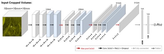The teacher (CropNet-b2-16mm) and student (CropNet-b4-16mm) networks consisted of ~14M and ~32M trainable parameters, respectively. The networks had architectures described in Section 2.2, processing cubic ROIs with 16 mm edges. The models’ dropout rates were set at 0.15. The model optimizations were performed using the Adam algorithm [] with (1) a learning rate of 0.00005 and (2) exponential decay rates for the first- and second-moment estimates of 0.9 and 0.999, respectively. Both models were trained using 12,000 batch-training iterations, without an early stopping condition. Each batch included (1) 150 positive and 150 negative samples for the teacher models and (2) 75 positive, 75 pseudo-labeled positive, 75 negative, and 75 pseudo-labeled negative samples for the student models. The implementation was performed using the Python programming language (v3.6.10), and the neural networks were created using the TensorFlow (v1.12.0) library. The training times for the teacher and student models were ~7.25 and ~10.5 h, respectively, using an NVIDIA Tesla V100 graphics card with 32 GB RAM.