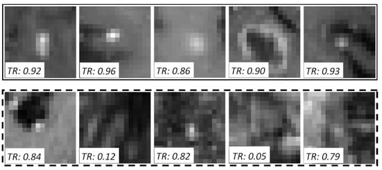 Mid-axial slices of an example pseudo-labeled batch of five pairs. The upper and lower rows show the positive and negative samples respectively. The response threshold () is 0.85, and the teacher model responses (TR = ) are given with the images.