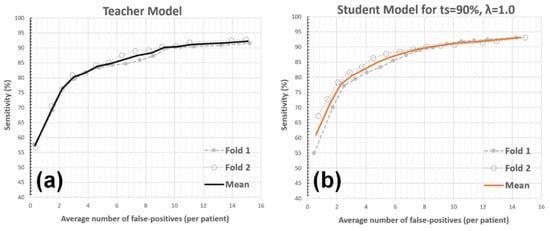 AFP versus detection sensitivity. The average number of false positives per patient (i.e., wrongly detected BM lesions for each patient) in relation to the sensitivity is illustrated for the teacher (a) and student (b) models. The mean curve (shown as the thick-line curve) represents the average of the CV folds.