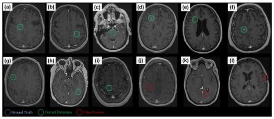 A set of detection examples. (a–i) Correct BM detections, (j,k) small vessels are wrongly detected as BMs, and (l) a formation in a surgical region is detected as a BM. The framework processes a given exam by first generating candidates and then processes these via CropNet, where the high response candidates are presented as the detection results.