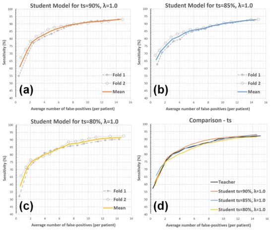 The response threshold () for setting the pseudo-labels is determined based on the teacher model’s detection sensitivity (ts) for the training data (see Equation (2)). In our proposed solution, ts was set as 90%, as the value is close to the maximum BM detection sensitivity the teacher model can achieve. In this analysis, values were determined by setting the teacher model’s detection sensitivity to 80% and 85% for the training bin; hence, the impact of more-specific yet less-sensitive pseudo-labeling was evaluated. The other parameters (i.e., and a single student model iteration) were kept unchanged during the experiment. Figure 7 and Table 2 present the findings of this analysis.