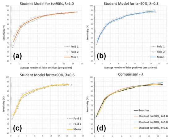 The impact of λ on the AFP metric. The student model performances for (a) λ = 1.0 (default setup), (b) λ = 0.8, (c) λ = 0.6, and (d) comparisons between the teacher and student models with these setups are presented.