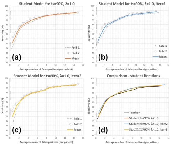 The experiment was targeted to assess the effect of further student training iterations, which are not part of our default solution due to low expected performance gains with a high additional computational cost. More explicitly, the student model from iteration-n (i.e., ) was used as the teacher model in the next iteration; becomes and generates pseudo-labeled data for the training of . Two additional training and testing iterations were performed for the experiment (i.e., the student model iterations 2 and 3), where the other default parameters were kept unchanged (ts = 90% and ). Please see Figure 9 and Table 4 for the corresponding results.