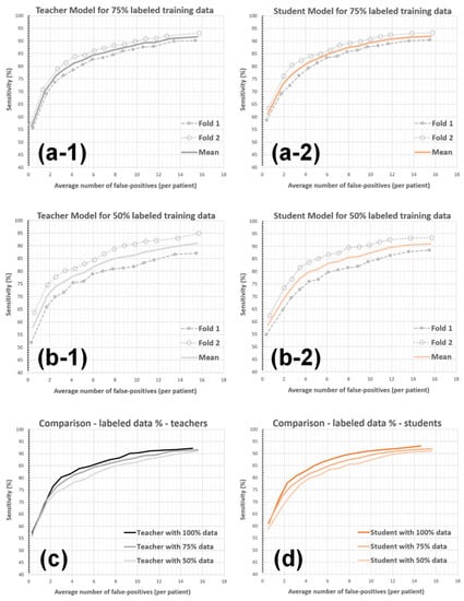 The impact of the amount of labeled data on the AFP metric. The teacher (a-1) and student (a-2) models were trained using 75% of the labeled data. The teacher (b-1) and student (b-2) models were trained using 50% of the labeled data. The teacher (c) and student (d) models were compared for different labeled-data utilization percentages.