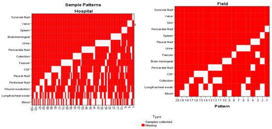 Postmortem sampling patterns. Sampling patterns identified by study group: for culture types we have 14 variables: blood, lung/tracheal swab, wound swab/skin tissue, pleural fluid, peritoneal fluid, pericardial fluid, cerebrospinal fluid (CSF), synovial fluid, collection/abscess, spleen, heart valve, urine and faeces. Missing values analysis identified in the study population 104 different patterns for hospital cases and 19 patterns for field cases.