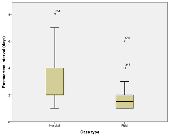 Postmortem interval in days according to case type; postmortem interval for sampling was significantly shorter for field cases compared to hospital cases mean postmortem interval: hospital cases 2.70 ± 1.272 days and field cases 1.83 days ± 1.108, (p < 0.001). ‘o, *’ high extreme values.