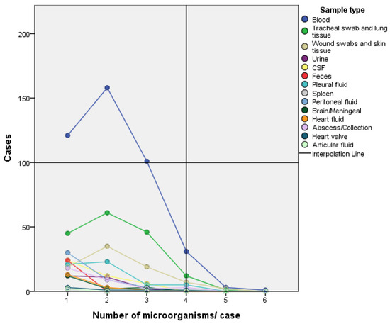Bacteriology results—positive cultures—number of microorganisms per case depending on sample type: blood cultures were positive for one to six microorganisms, tracheal swab and lung tissue sample cultures and wound swabs and skin tissue cultures were positive for one to five microorganisms; for pleural fluid, spleen and heart valve tissue sample cultures and collection cultures’ positive results found one to four microorganisms/case; peritoneal fluid and pericardial fluid samples’ positive cultures revealed one to three microorganisms/case; urine cultures identified one or two microorganisms; articular fluid, cerebrospinal fluid cultures (CSF), meningeal and brain tissue samples’ positive cultures all identified one microorganism.
