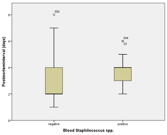 The number of microorganisms/culture did not vary significantly with case type; thus, 70.8% of blood cultures for hospital cases were polymicrobial, while 31.3% were monomicrobial for field cases (p = 0.86). Comparison between microorganisms identified in blood cultures and the postmortem interval identified only one statistically significant association, respectively; the result was the Staphylococcus species (spp.—olymicrobial-microorganisms from the family) (median negative results 2.68 ± 1.28 days and positive 3.52 days ±1.209, p = 0.003)—Figure 5.