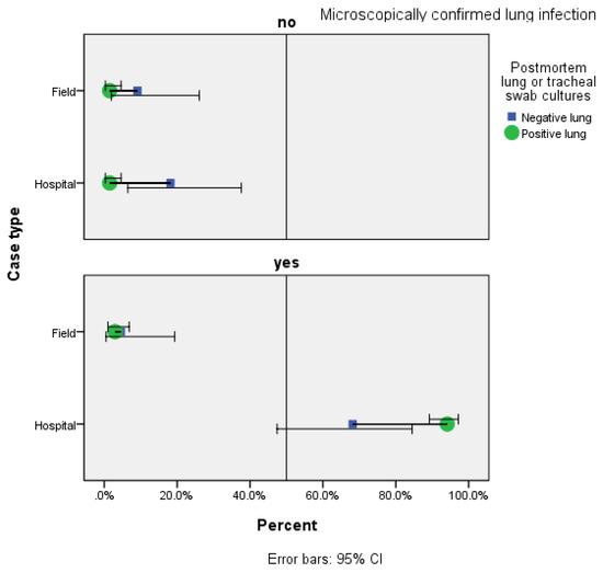 Dividing our population by case type (field or hospital), we performed a stratification analysis using Cochran’s and Mantel-Haenzel Statistics for the association of postmortem lung or tracheal swab cultures and histologically confirmed lung infection. In the hospital group, microscopically confirmed lung infection coincided with positive cultures for respiratory samples in 128 cases (89.5%), while absence of lung injury was associated with negative culture in 4 cases (66.7%). For the field group, positive cultures and microscopically confirmed lung infection were identified in four cases (80.0%), with no significant difference in culture results for the absence of lung injury. In the hospital group, a positive postmortem lung or tracheal swab culture result was significantly associated with a microscopically confirmed lung infection (p = 0.001) in contrast to our field group, where the postmortem organ specific culture results demonstrated no significant association to the confirmed lung injury (p = 0.81). Regardless of the case type, the postmortem bacteriology result of respiratory system related samples demonstrated a statistically significant association to the microscopically confirmed lung infection (p < 0.001). Without the case type stratification (hospital or field case) of study cases, the overall probability of obtaining a positive bacteriology result for lung and tracheal swabs samples is 12.37 (95% CI: 3.15–48.57) times greater in the microscopically confirmed lung infection. The results of the Mantel-Haenszel Common Odds Ratio Estimate show that after controlling for case type, the probability of a positive culture in a microscopically confirmed lung infection is 10.21 times greater in hospital cases than in field cases (p = 0.004, ORMH = 10.21 (95% CI: 2.11–49.26)—Figure 6.