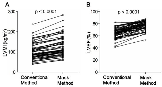 Measurements with the mask method resulted in greater LVMI (A) and LVEF (B).