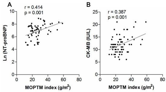 Correlations between mass of papillary and trabecular muscles (MOPTM) index and Ln (NT-proBNP) (A), and CK-MB (B).