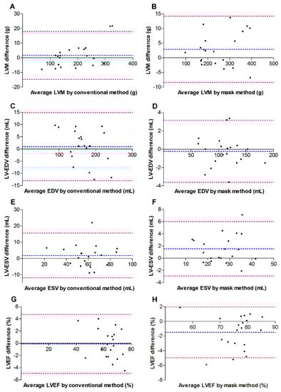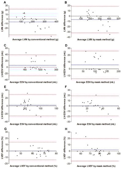 Bland–Altman plots indicating intra-observer agreement for 20 randomly selected subjects. (A,C,E,G) indicate data for the standard method. (B,D,F,H) indicate data for the standard method. Blue dashed line, bias; red dashed line, 95% limits of agreement between inter-obsever variability. EDV, end diastolic volume; ESV, end systolic volume; LVEF, left ventricular (LV) ejection fraction; LVM, LV mass.