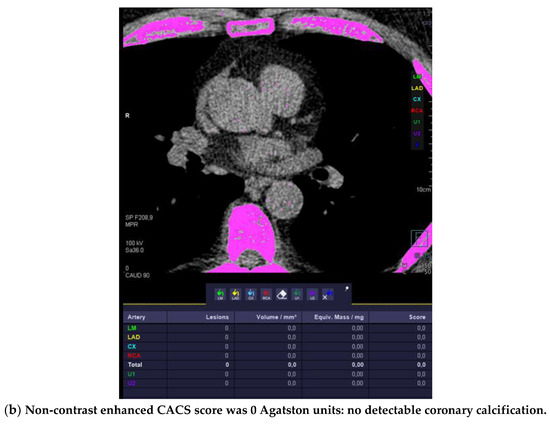 A non-contrast ECG-gated CT scan with standardized scan parameters (detector collimation 64 × 1.5 mm, 120 kV; image reconstruction 3 mm slice width, increment 1.5), and prospective ECG-triggering was performed. The Agatston Score (AU) was calculated.
