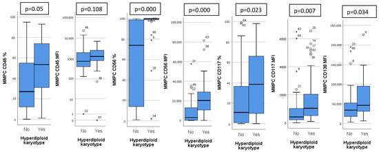 Significant differences in immunophenotype between hyperdiploid and non-hyperdiploid karyotype patients. CD45, CD56, CD117 measured as percentage of positive MMPC cells and mean fluorescence intensity (MFI), CD138 measured only as MFI. Outliers marked with *.