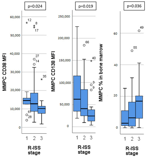 Significant differences in immunophenotype between different Revised—International Staging System (R-ISS) for multiple myeloma. MMPC—malignant plasma cells. MFI—mean fluorescence intensity. Outliers marked with *.