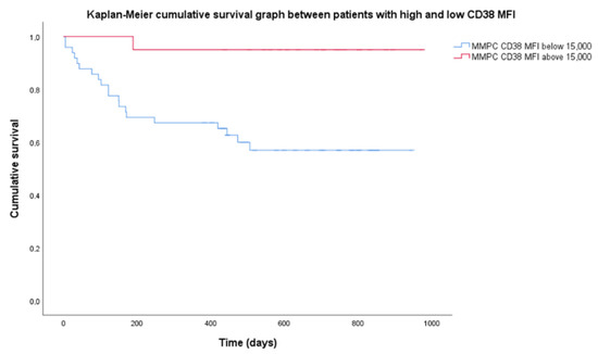 Difference in cumulative survival between subgroups of high and low CD38 expression. High expression of CD38 defined as mean fluorescence intensity (MFI) above 15,000 (20 patients), low—MFI below 15,000 (53 patients). MMPC—malignant plasma cells.