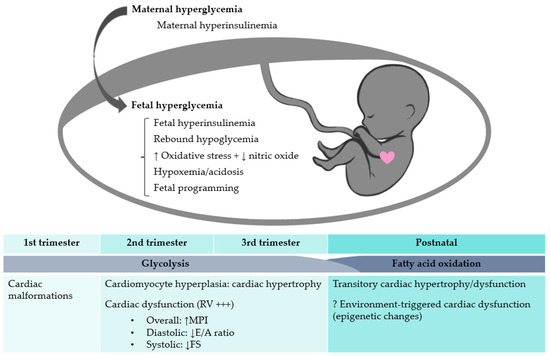 GD puts the mother, fetus, and newborn at increased risk of adverse outcome, dependent on the maternal glycemia at 24–28 weeks of gestation, without threshold for most complications [3]. The risk of intrauterine fetal demise is increased five-fold in GD, and the cause cannot be determined in 50% of cases [4]. Several explanations have been proposed: macrosomia due to fetal hyperinsulinemia, excess fat deposition, increased metabolism with fetal hypoxemia [4], and even cardiac dysfunction [5]. However, to present, there are no efficient tools to predict and prevent GD-related stillbirth, since it can occur even in well-controlled diabetes [5]. In this regard, subclinical cardiac dysfunction could be a lucrative research avenue, since recent studies have shown that fetuses exposed to GD exhibit impaired contractility before cardiac hypertrophy [6,7,8] and despite good glycemic control [9]. The pathophysiology of these cardiac changes is not fully clear, but several mechanisms have been incriminated (Figure 1). Although insulin does not cross the placenta, GD-associated maternal hyperinsulinemia could affect the fetus through placental insulin receptor mediation, while glucose passing freely through the placenta into the fetal circulation could stimulate fetal pancreatic ß-cells [10]. Thus, GD associates simultaneous maternal and fetal hyperinsulinemia, with potential deleterious effects on the fetal cardiac function [10]. Additionally, animal studies have found that hyperglycemia is linked to an excess of reactive oxygen species [11]. The degree of oxidative stress correlates with maternal glycemic control and interventricular septum (IVS) hypertrophy in diabetes-exposed neonates [12]. Bradley et al. found significant acidosis and increased lactate levels in the umbilical cord of diabetes-exposed fetuses and suggested this hypoxemic environment could explain stillbirth [13]. Moreover, Lehtoranta et al. proved that expression of key genes involved in cardiomyocyte electrophysiology, contractility, and metabolism are altered in rat models of fetuses exposed to maternal hyperglycemia, and suggested this leads to cardiac dysfunction and increased fetal vulnerability to hypoxemia [14].
