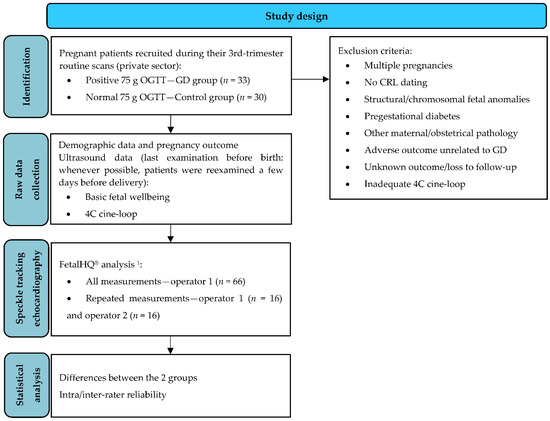 Study design flowchart. 1 For 3 control cases, FetalHQ® analysis was repeated once at a different gestational age (more than 3 weeks apart), to match the number of GDM FetalHQ® examinations (±2 days). 75 g OGTT, 75 g oral glucose tolerance test; GD, gestational diabetes mellitus; CRL, crown-rump length; 4C, 4 chamber view.