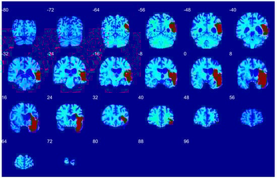 Figure 4. Coronal sections showing automatic segmentation of left MCA stroke as mapped on MNI152 template. The brain slices are sampled at the intervals of 8 mm.