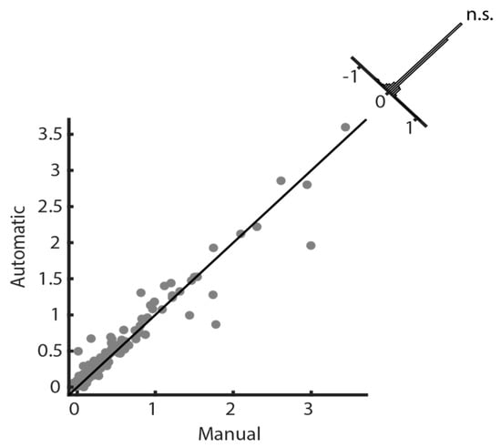 Figure 7. A scatter plot with a histogram of differences shows no significant difference (Wilcoxon rank-sum test, p-value = 0.84, n.s. stands for non-significant) between the manual and automatic lesion volumes across cross-validation folds. Segmented lesion volumes (×105 mm3). The gray dots represent total lesion volumes for individual subjects from the selected cross-validation folds.