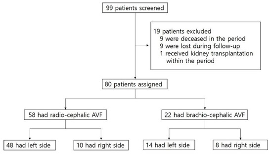 We retrospectively reviewed the records and angiographic images of 99 patients who had immature fistulas and thereby received PTA in the period between February 2013 and March 2019 at Chungnam National University Hospital. Among the 99 patients, 19 were excluded for the following reasons: 9 deceased in the period, 9 were lost during follow-up, and 1 received kidney transplantation within the period. Of the 80 eligible patients, 22 had brachio-cephalic (BC) AVF and 58 had radio-cephalic (RC) AVFs (Figure 1).