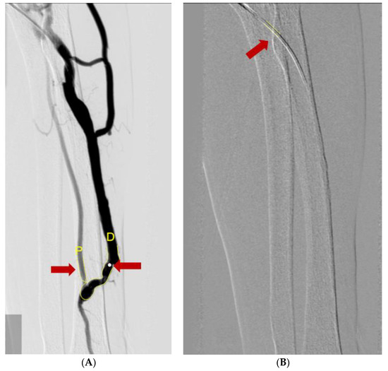 Measuring diameters of vessels using the Cardiovascular Angiography Analysis System. (A) The diameter of the catheter (red arrow) was used for the calibration reference. (B) A/F ratio was measured by ratio of diameter of radio-cephalic artery (red arrow and yellow letter P) and AVF vessel (red arrow and yellow letter D).