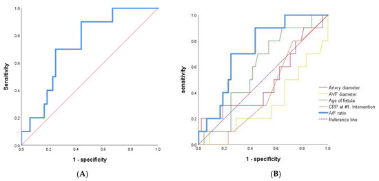 ROC-AUC curve analysis. (A) A/F ratio as the sole independent predictor of early AVF failure after primary PTA in early failure versus patent groups with immature AVF of RC type (n = 58). (B) The traditional factors, including age of fistular, artery diameter, AVF diameter, CRP and A/F ratio were analyzed.