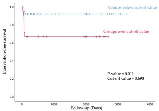 We stratified into below group and over group based on the cut-off value of A/F ratio, and then analyzed the intervention-free survival rate using the Kaplan–Meier curve. Groups below the 0.690 value of A/F ratio showed longer intervention-free survival within 90 days after first AVF use (p value = 0.011, Figure 5).