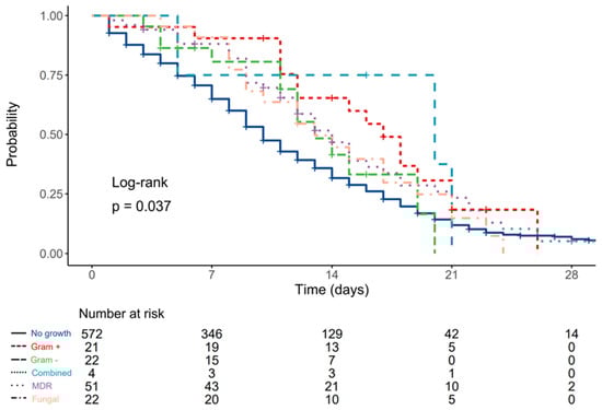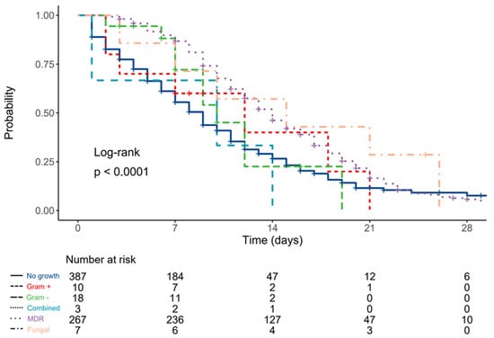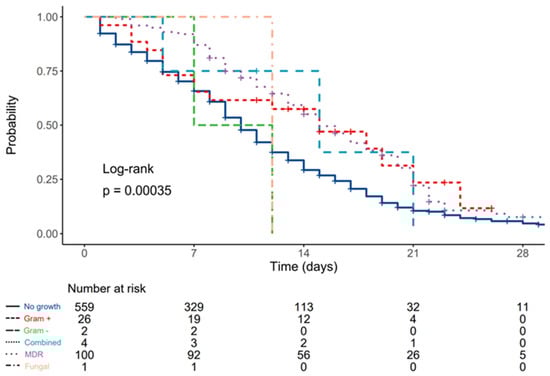 Median survival was 10 (9–11, 95% CI) days for patients without urinary infections, 17 (12–NA, 95% CI) days for patients with Gram-positive antibiotic-susceptible isolates, 13 (12–NA, 95% CI) days for patients with Gram-negative antibiotic-susceptible isolates, 20 (5–NA, 95% CI) days for patients with combined antibiotic-susceptible pathogens, 14 (12–18, 95% CI) days for patients with MDR isolates, and 13 (10–21, 95% CI) days for patients with fungal growth in urinary samples.